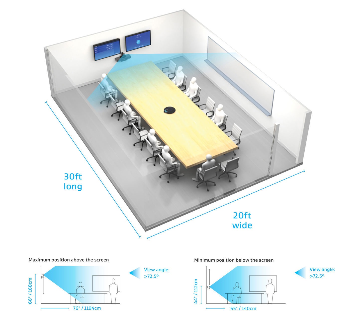 Dolby Voice Room Pro is designed for easy setup. The recommended placement for the Dolby Conference Phone is in the center of the table. The new Dolby Voice Camera Pro can be placed either above or below the screen.